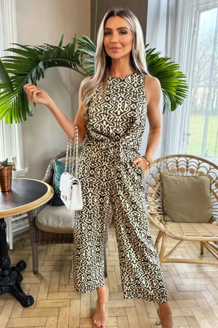 Green And Blue Geometric Multi Printed Wrap Top Belted Jumpsuit