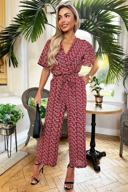 Red Floral Printed Butterfly Sleeve Belted Jumpsuit