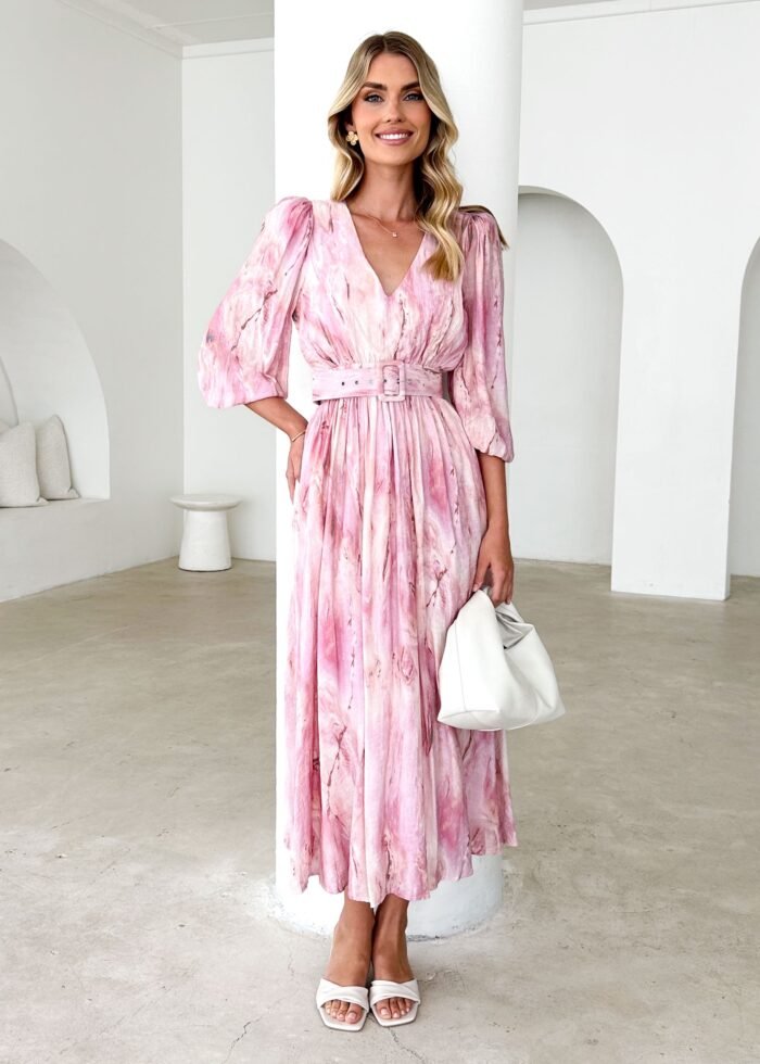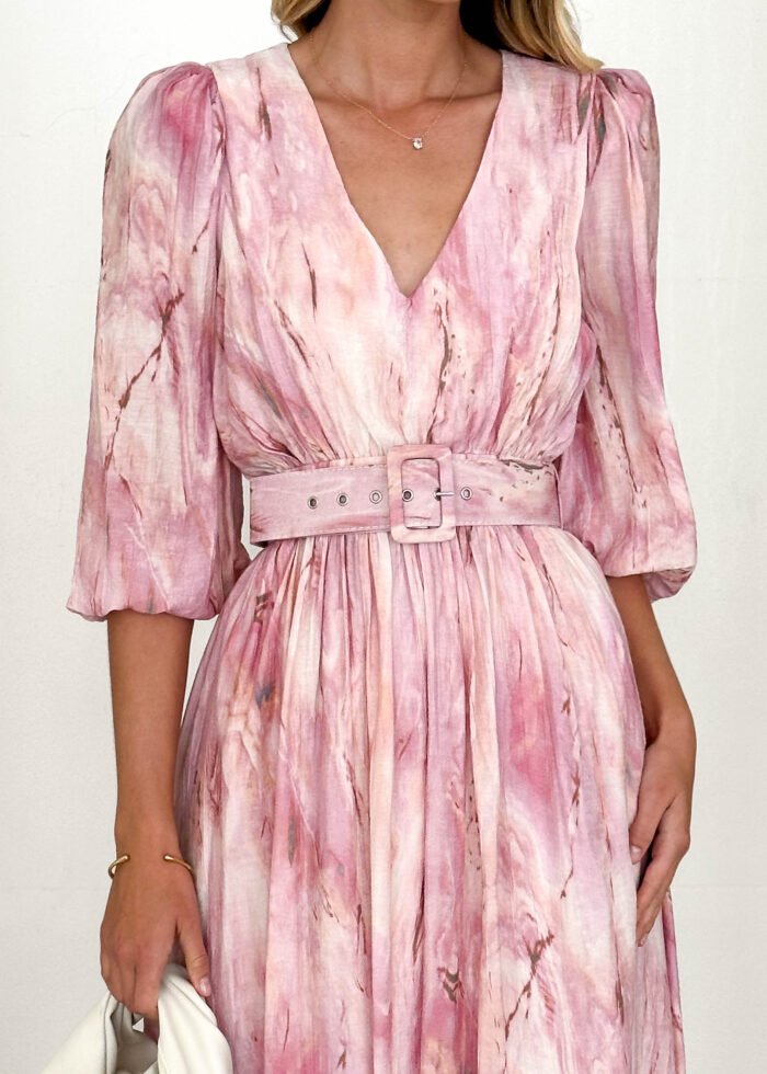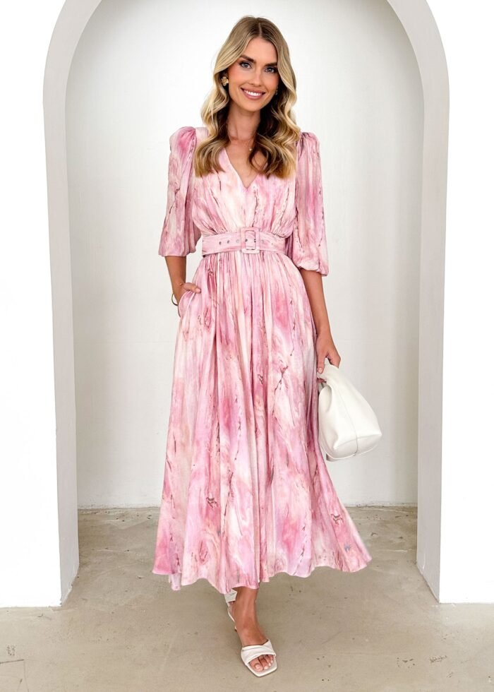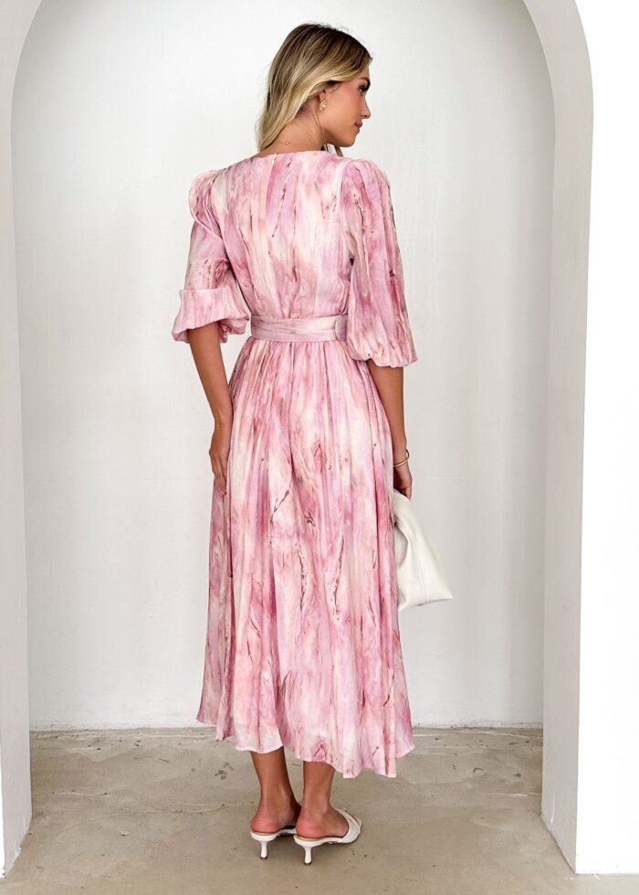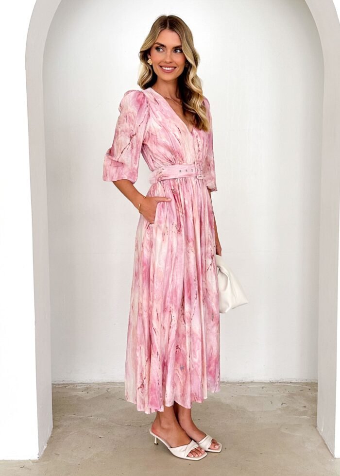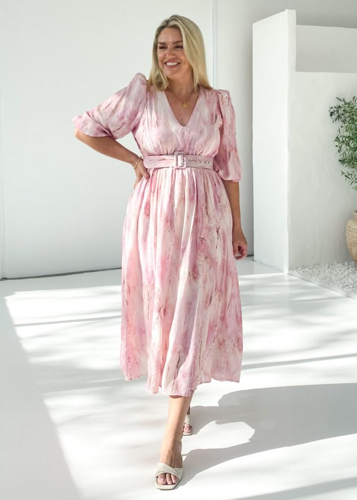 Elevate your style with the Analissa Midi Dress in Pink Marble. This captivating dress showcases a unique pink marble print that exudes artistic flair and sophistication. Crafted from lightweight fabric. it offers an easy fit that’s perfect for any occasion. Pair this dress with nude heels and a sleek clutch for an effortlessly polished look. Add delicate silver jewellery and a high ponytail to accentuate the elegant neckline. Ideal for brunch dates or evening soirées. the Analissa Midi Dress is a must-have for your wardrobe.
