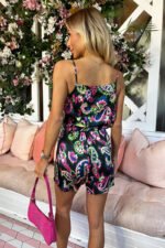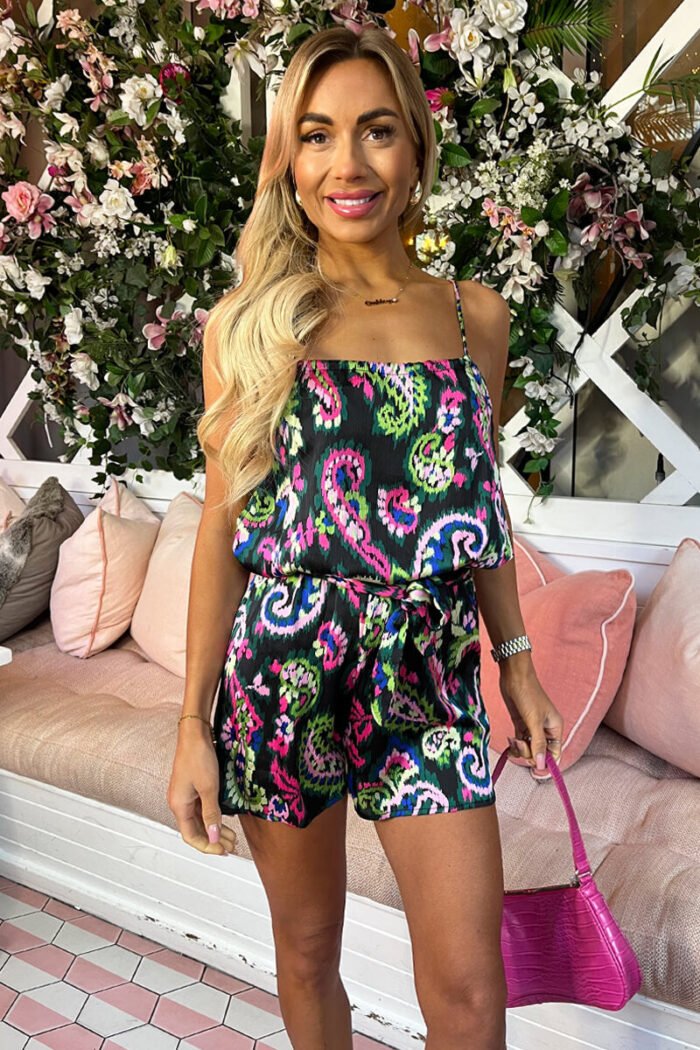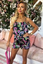 This Black Printed Strappy Tie Belt Playsuit is an essential wardrobe