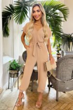 Stay cute in this Stone V Neck Short Sleeve Belted Elasticated Cuff